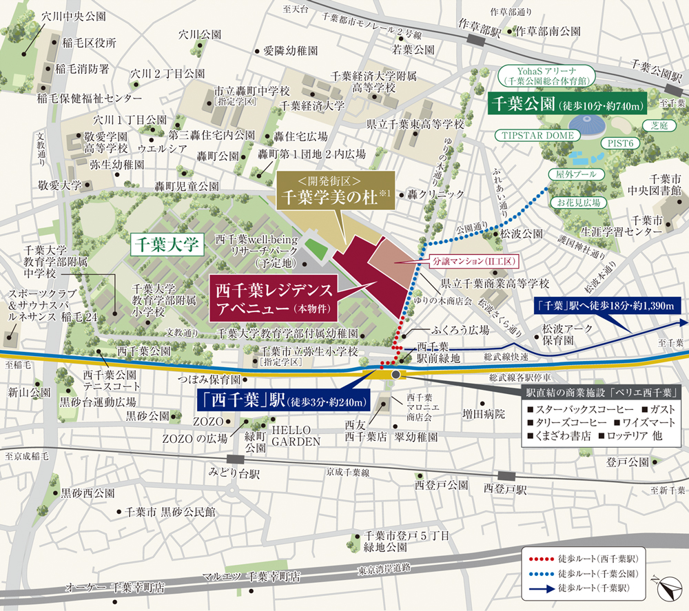 駅直結の大型複合施設「ペリエ西千葉」をはじめ、西友西千葉店や多彩な商店街が生活圏に。周辺では緑地帯や公園の整備も進み、千葉大学や教育施設、公園が点在する落ち着いた環境です。都市利便性と自然が調和し、子育て世代からシニアまで幅広く暮らしやすい地域となっています。
